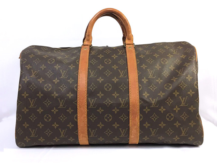 今回買取させていただいた幅50cmの他、全4サイズがあり、小さいものでも45cm~と収納力たっぷりのバッグですが、丸みを持たせたレザーハンドルで、持ち運びがしやすいようデザインされています。開口部はダブルファスナーで、引き手にパドロック(南京錠)で鍵をかけることができ、ネームホルダーも付いていて、荷物を預ける際にも安心の備えです。また、折りたたみ可能で、荷物の増減に合わせて、スーツケースなどに収納することができるのもルイヴィトンの旅行バッグの特徴です。